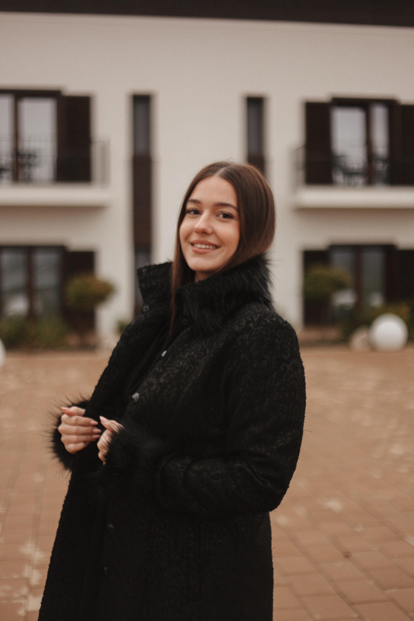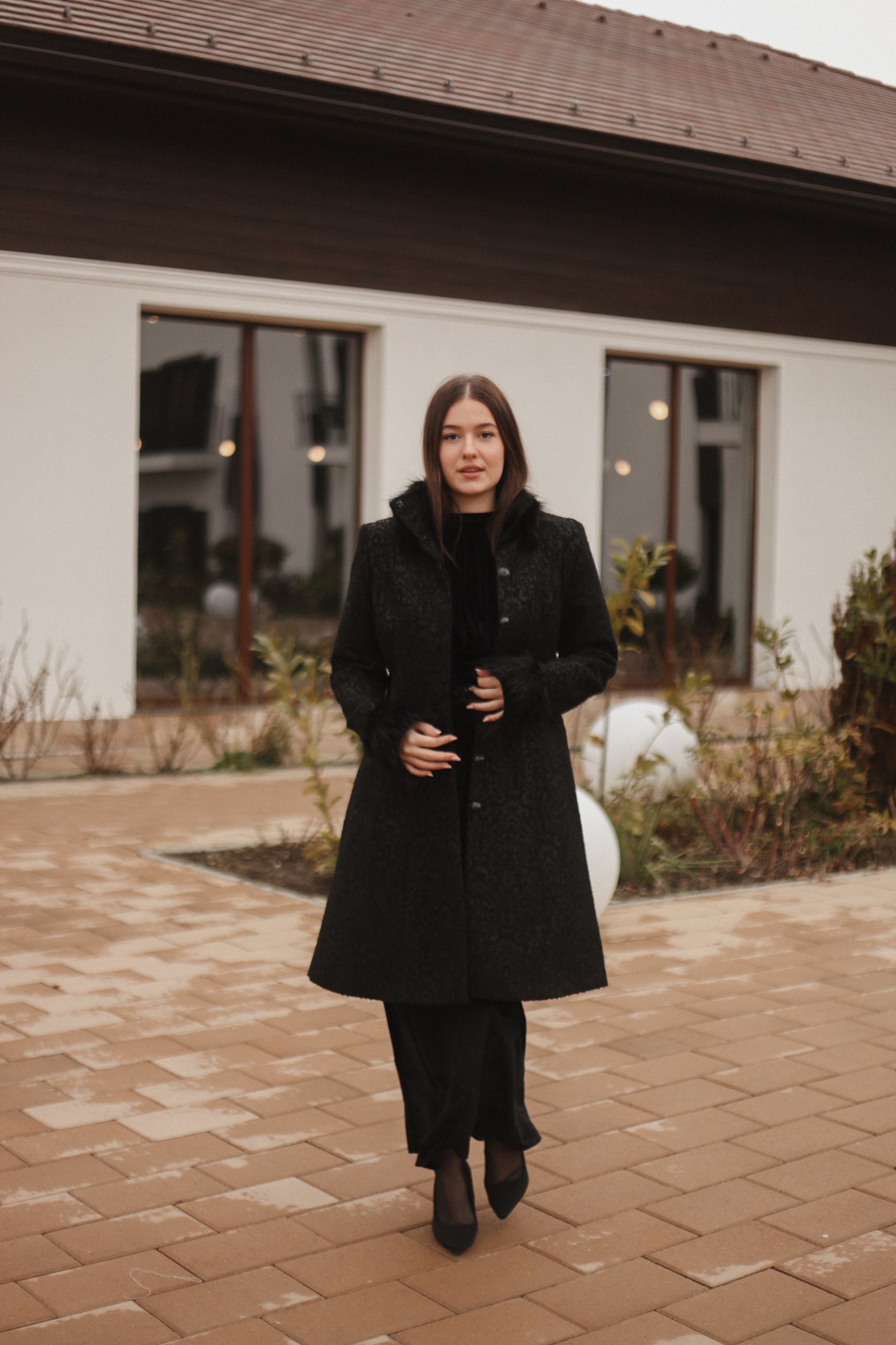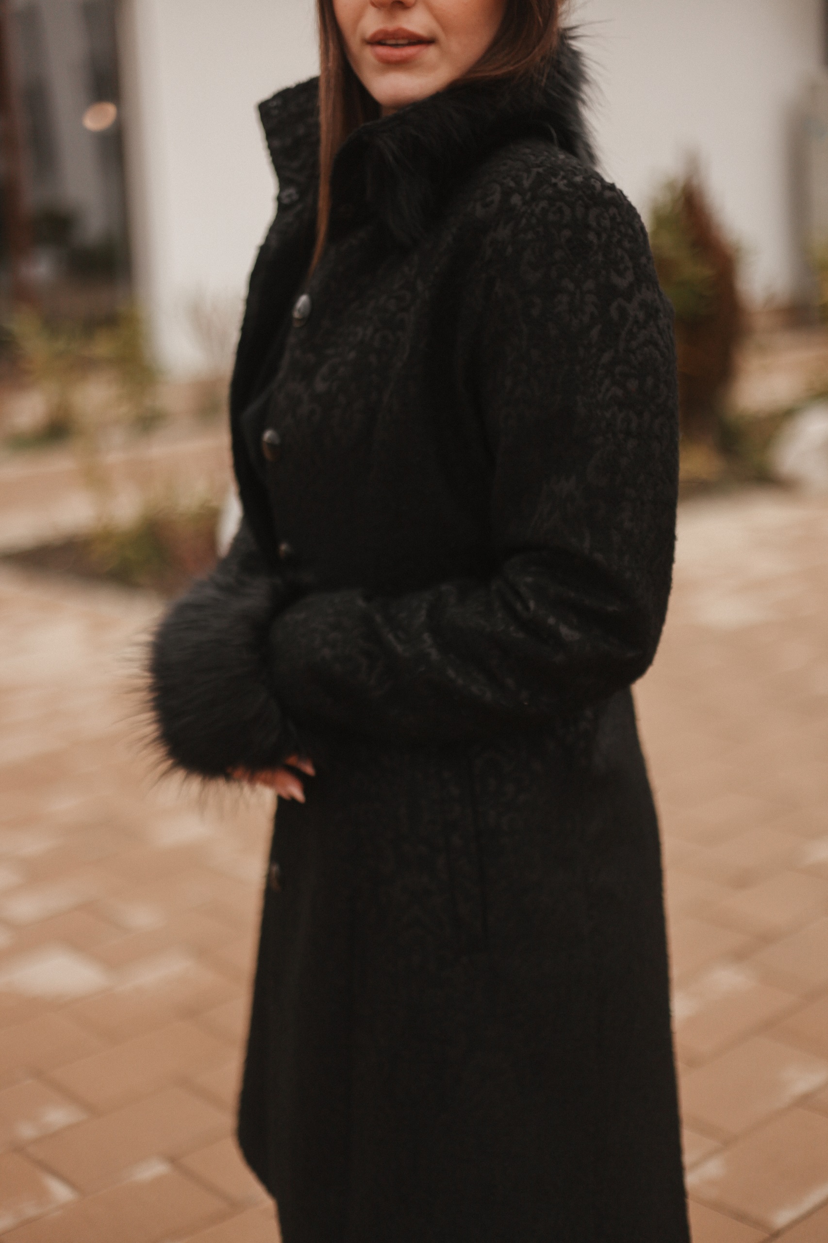 Paltonul Nalina este un palton foarte elegant realizat dintr-o stofă fină cu imprimeuri cu blană la mânecă și guler.