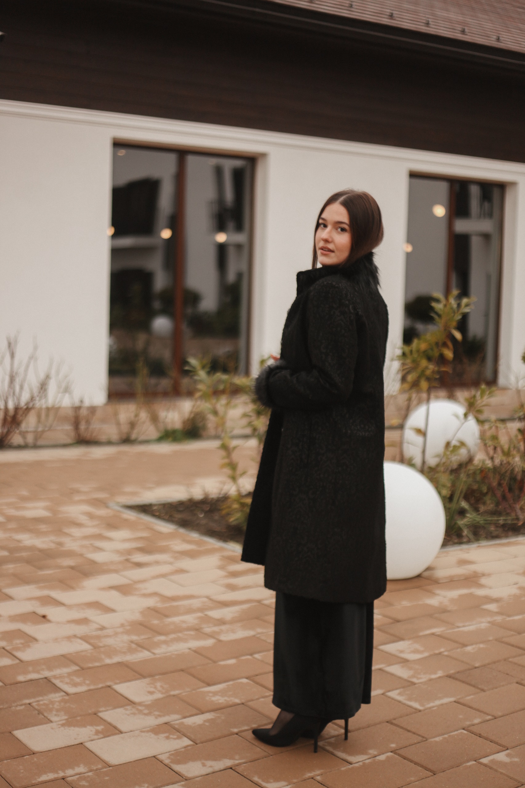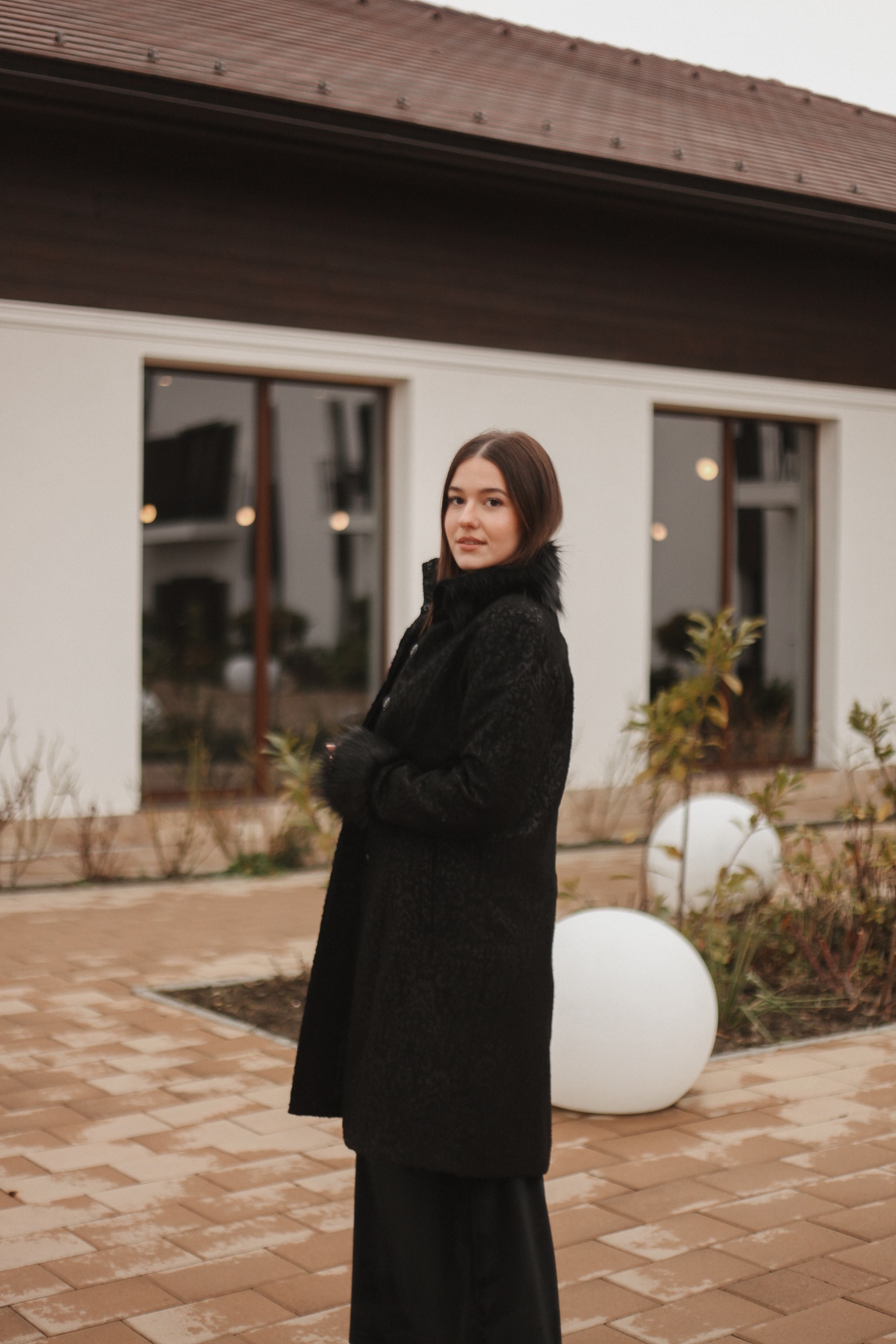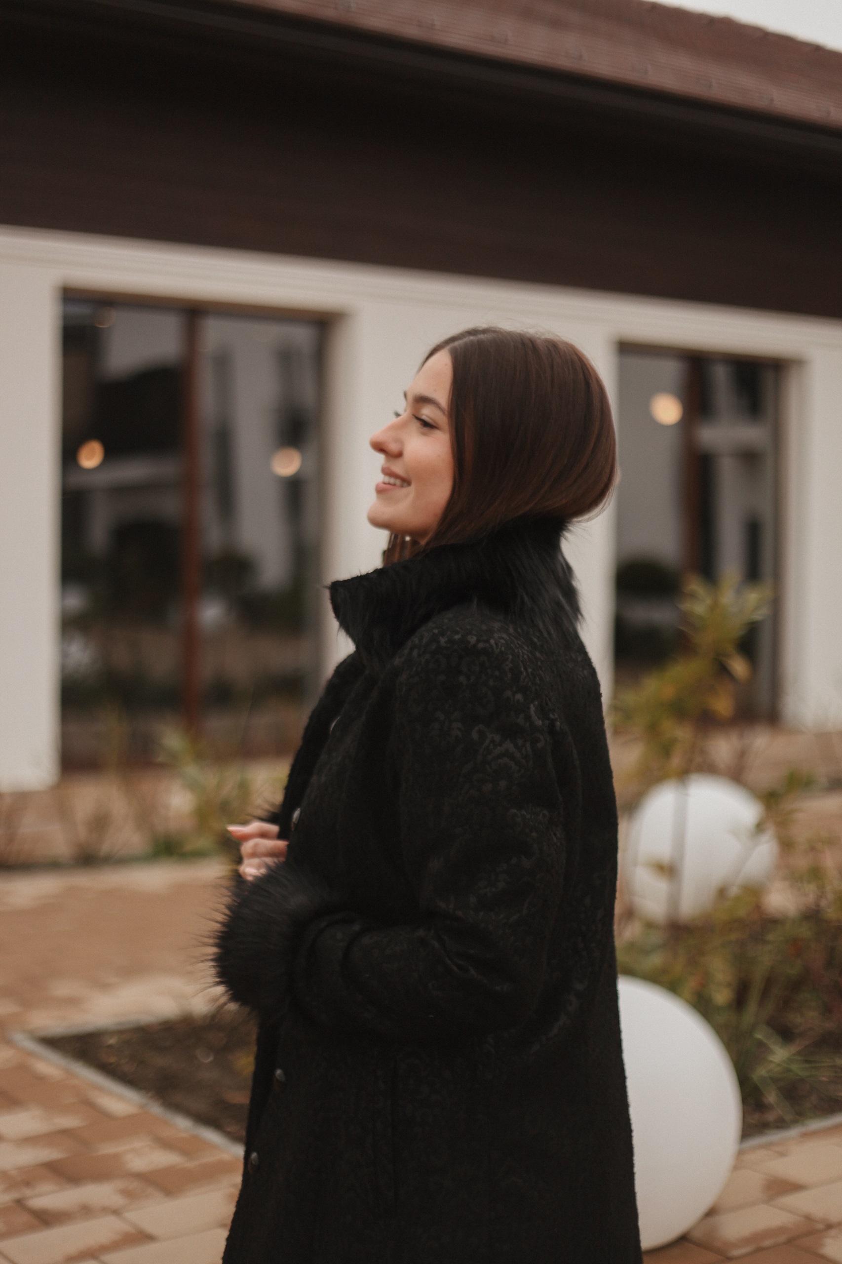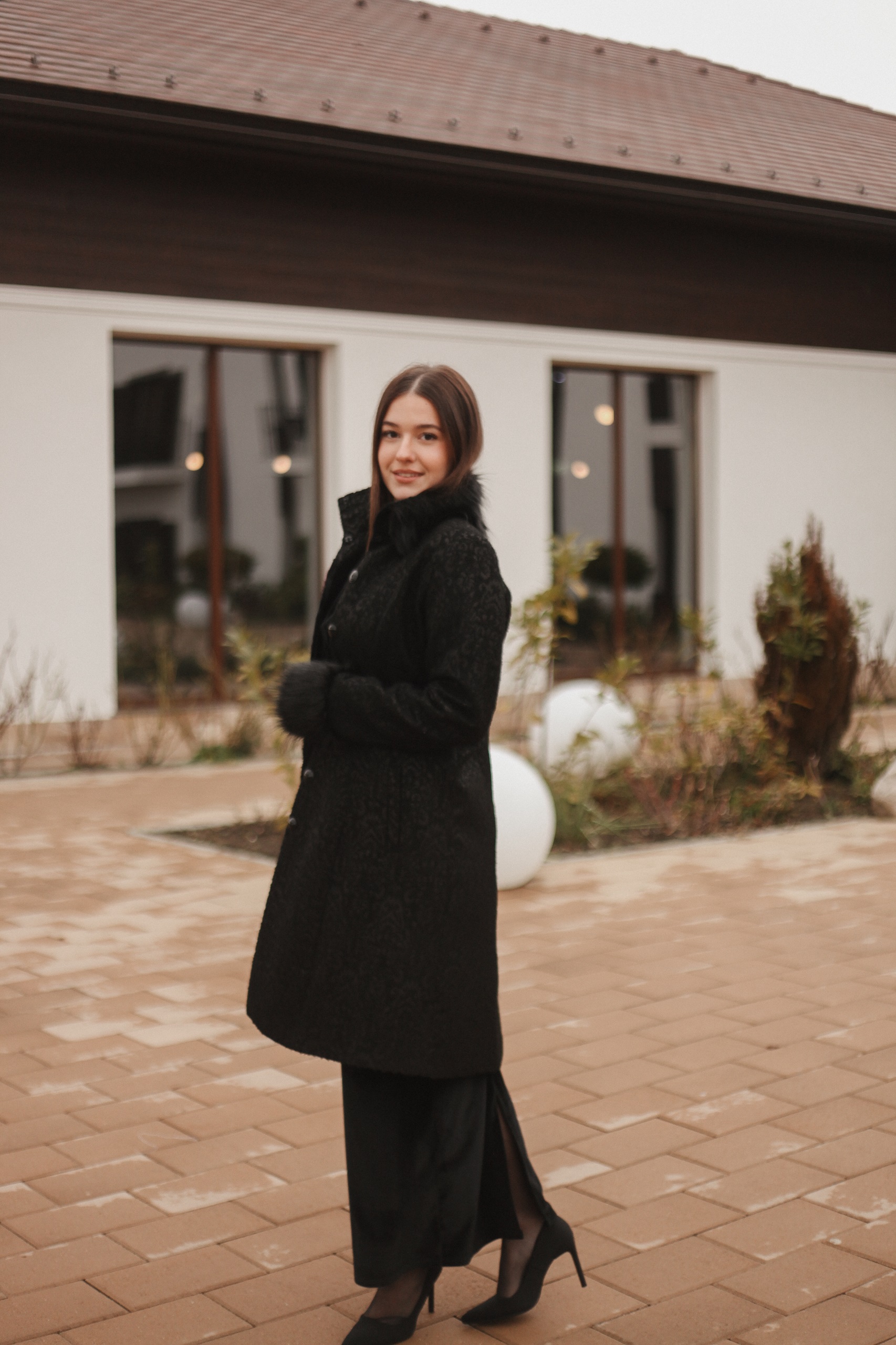 Paltonul Nalina este un palton foarte elegant realizat dintr-o stofă fină cu imprimeuri cu blană la mânecă și guler.