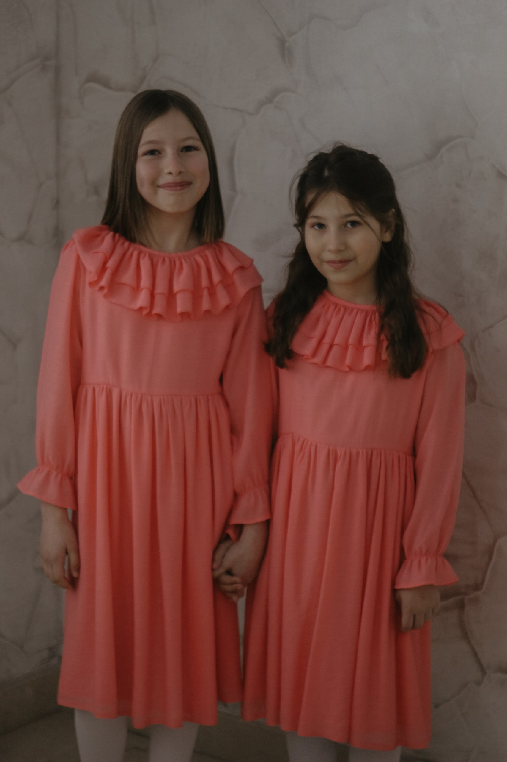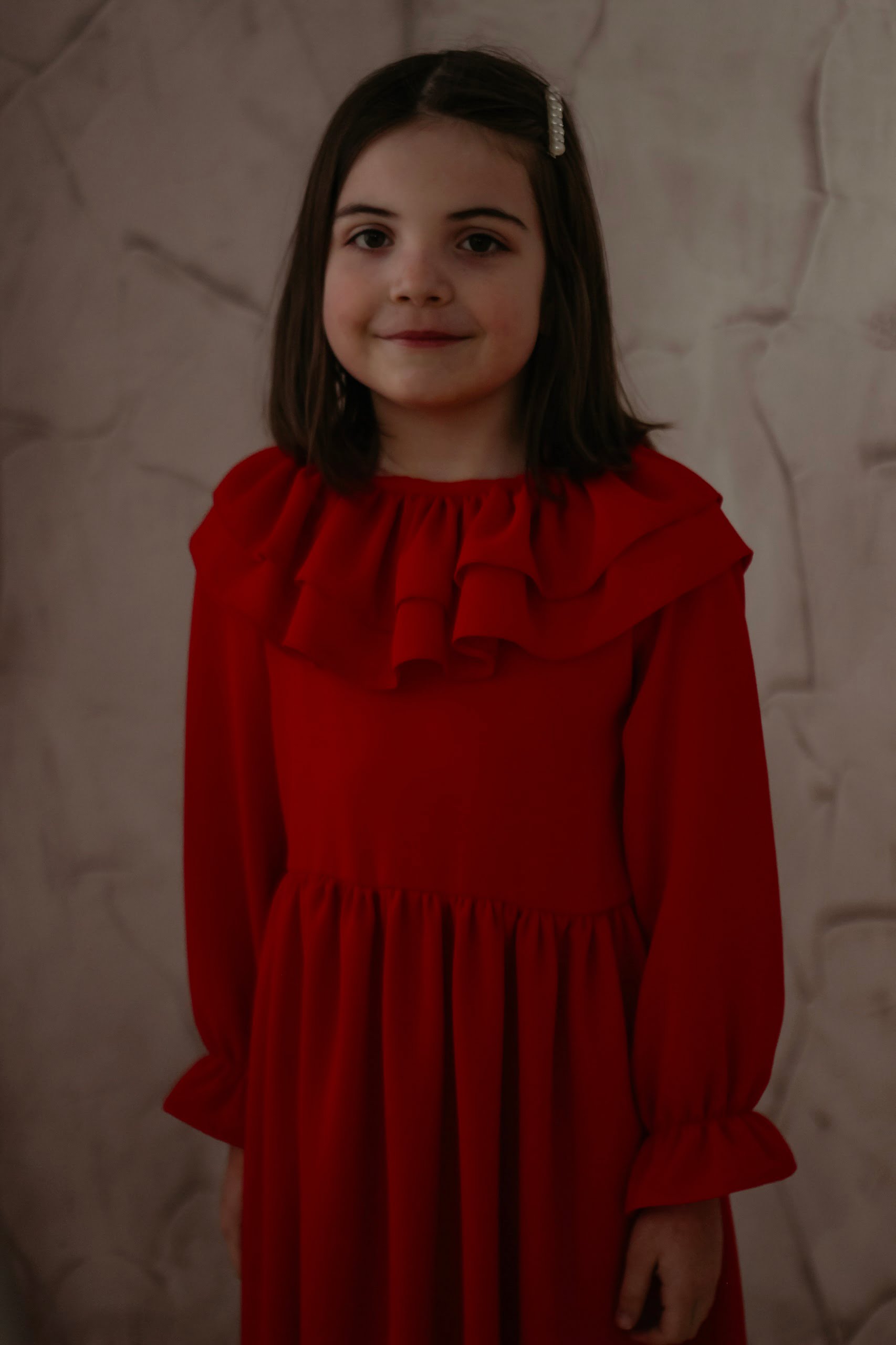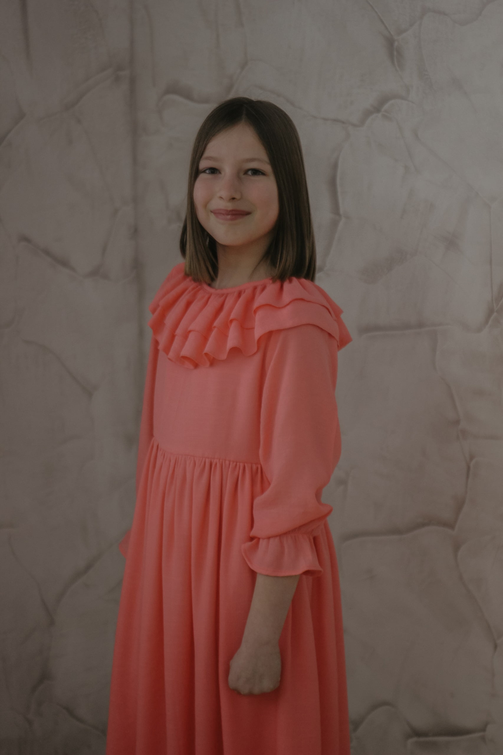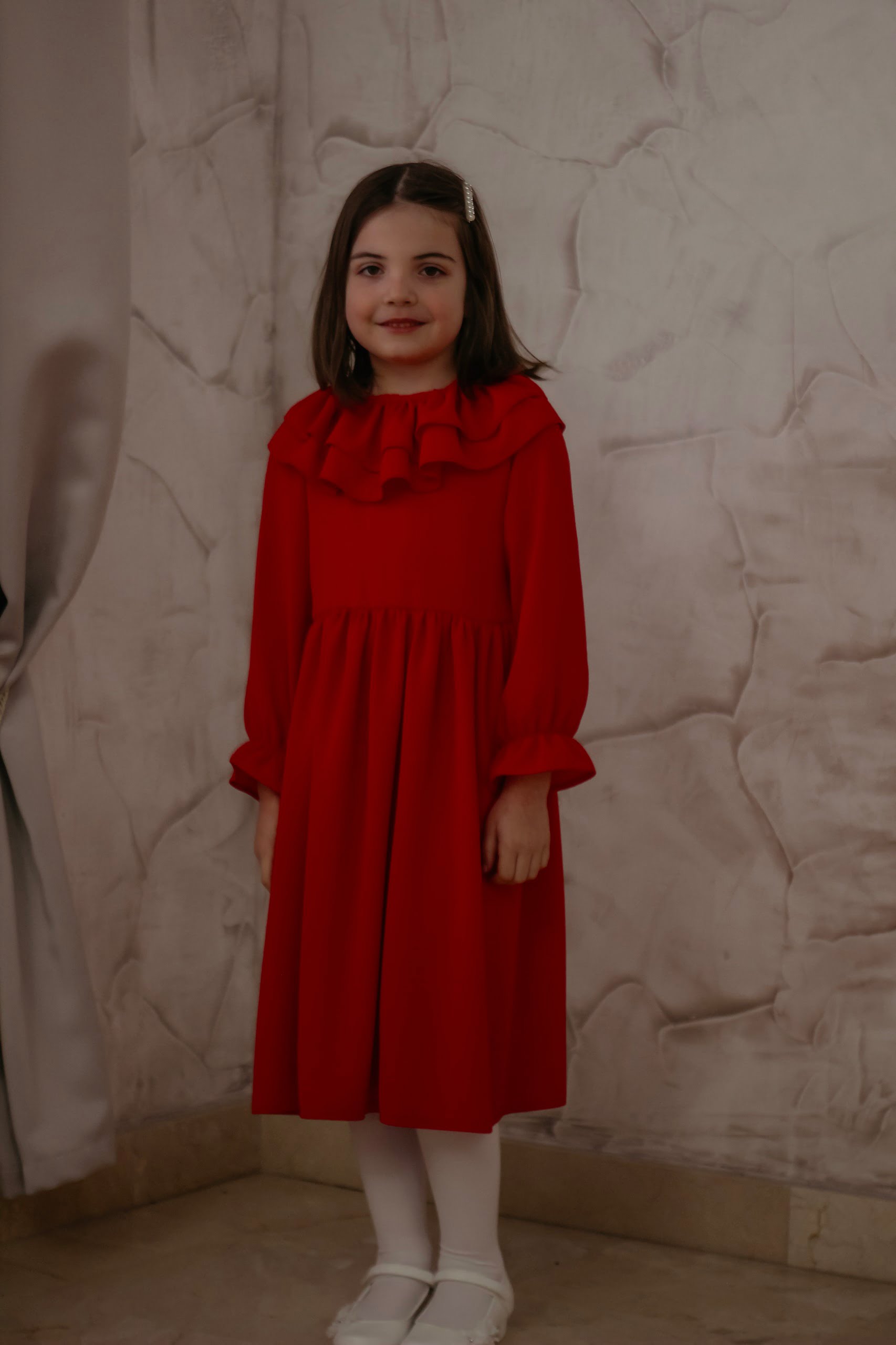 Este o rochie elegantă cu guler cu volane,