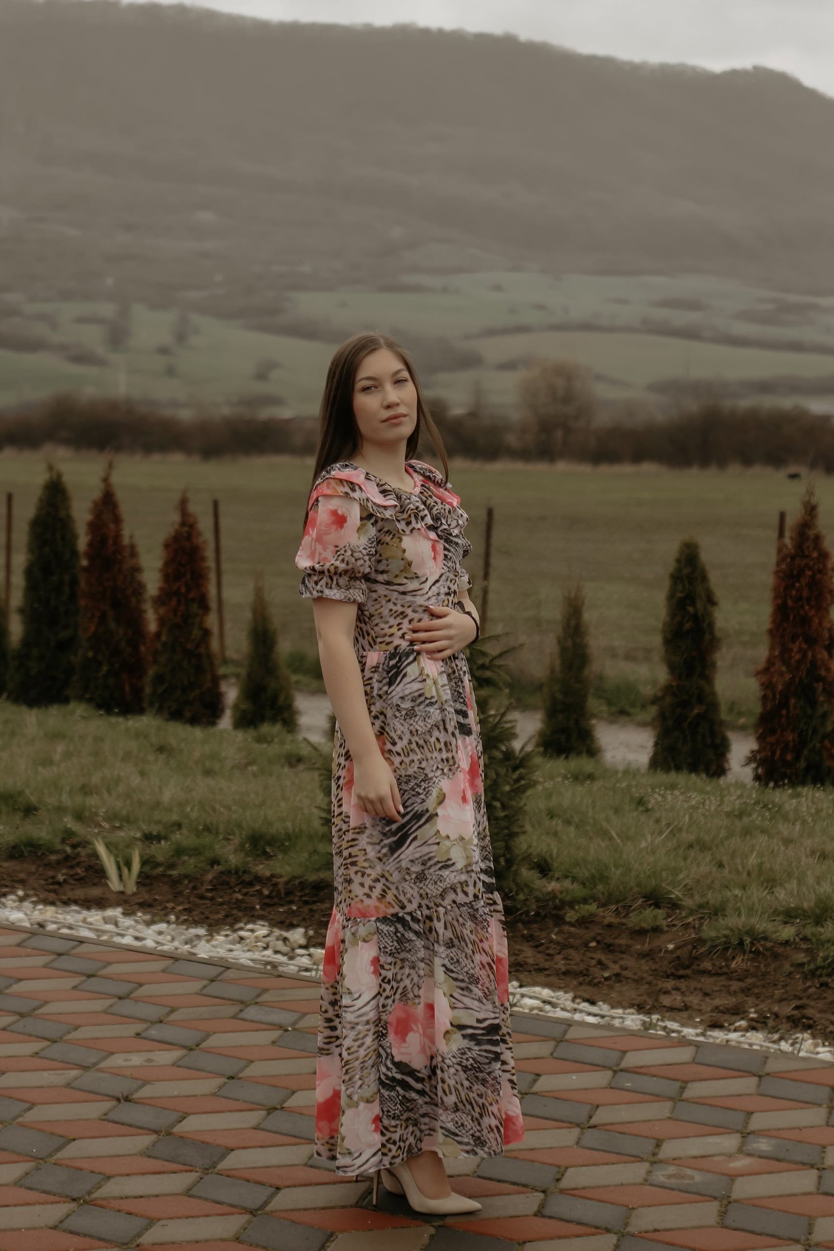 Este o rochie elegantă cu guler cu volane