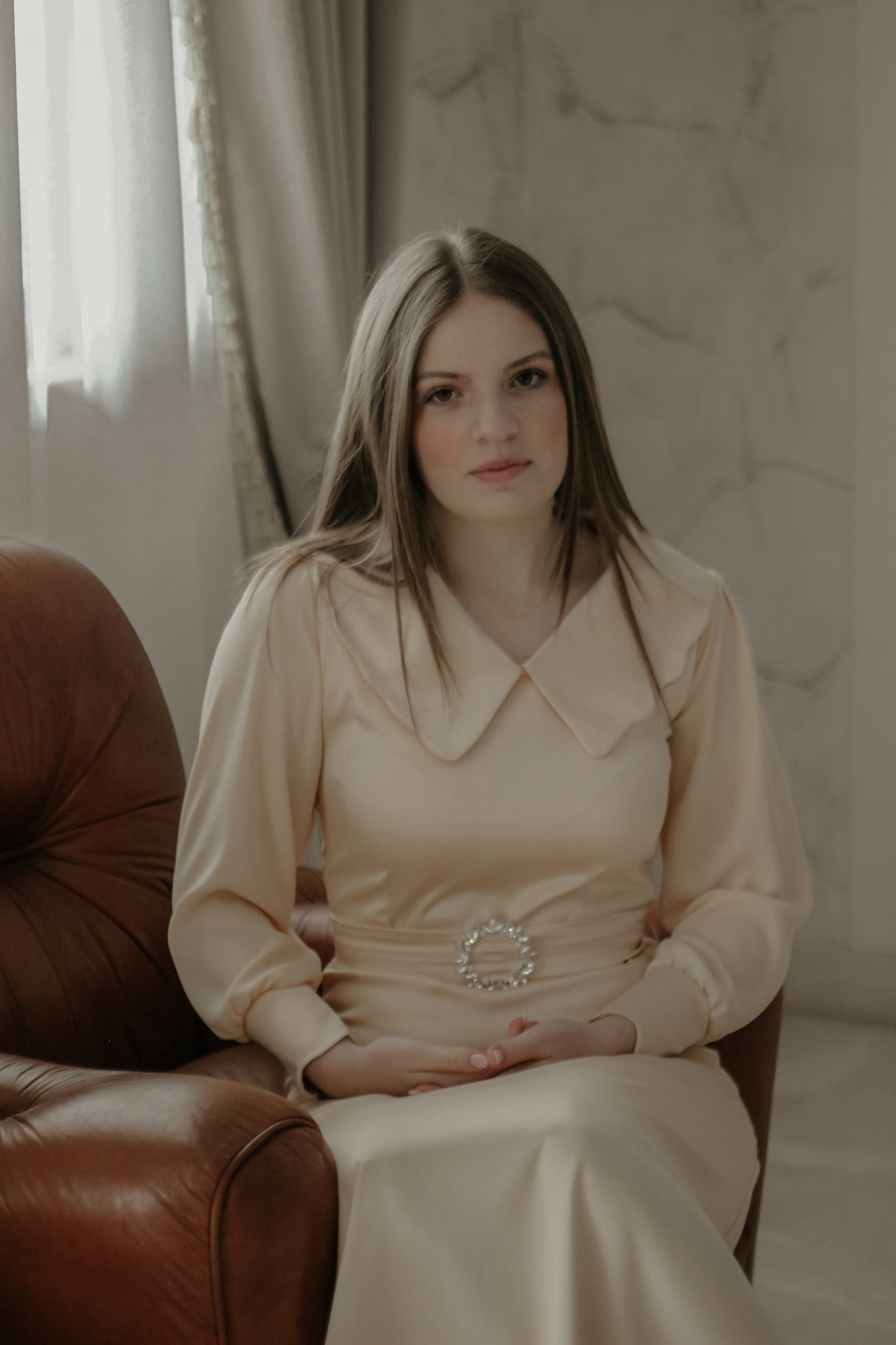 cu fermoar ascuns la spate, mânecă din triplu voal cu manșetă din tafta elastică.