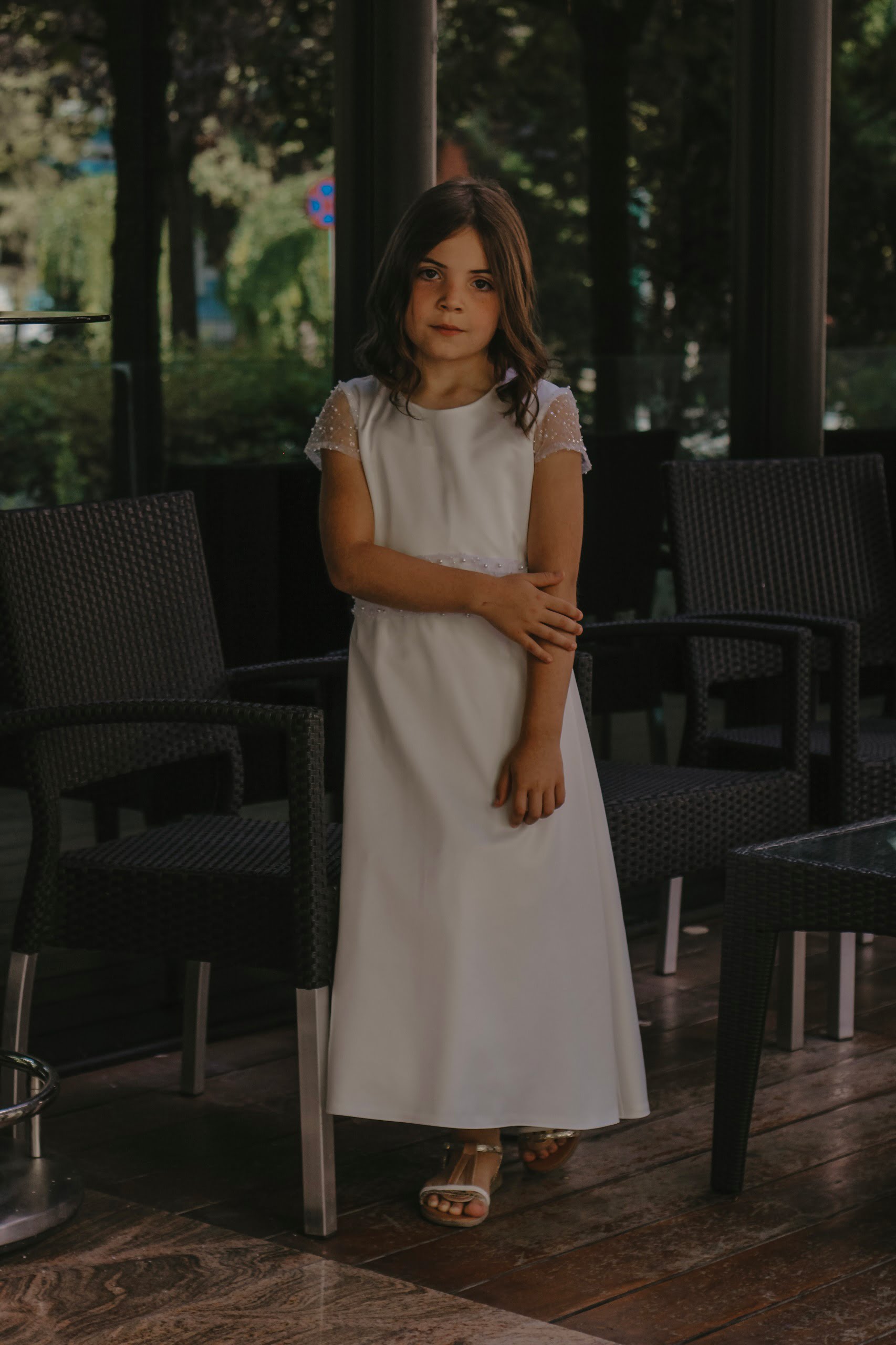 Fermoar ascuns la spate, mânecă de dantelă și brâu cu perle în talie.
