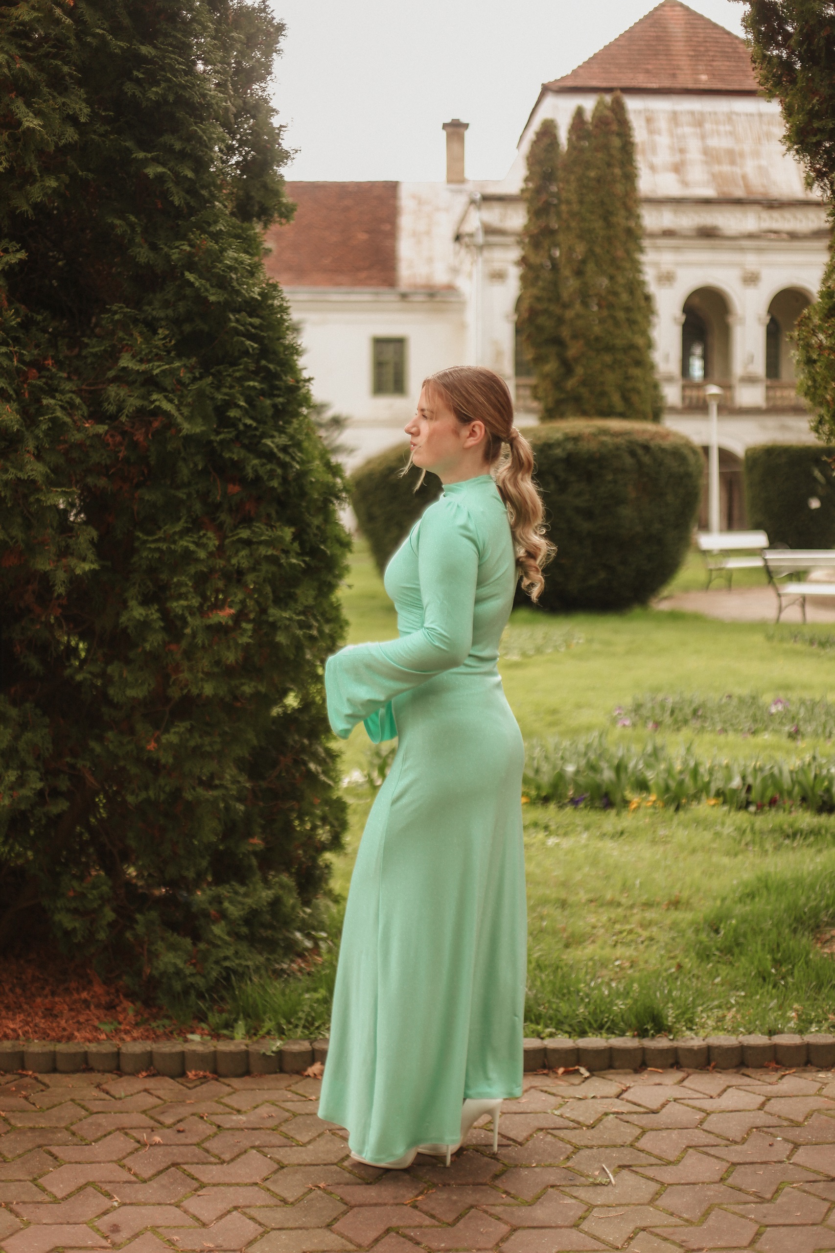 ✔ Mâneci evazate și guler înalt – detalii ce adaugă un aer regal