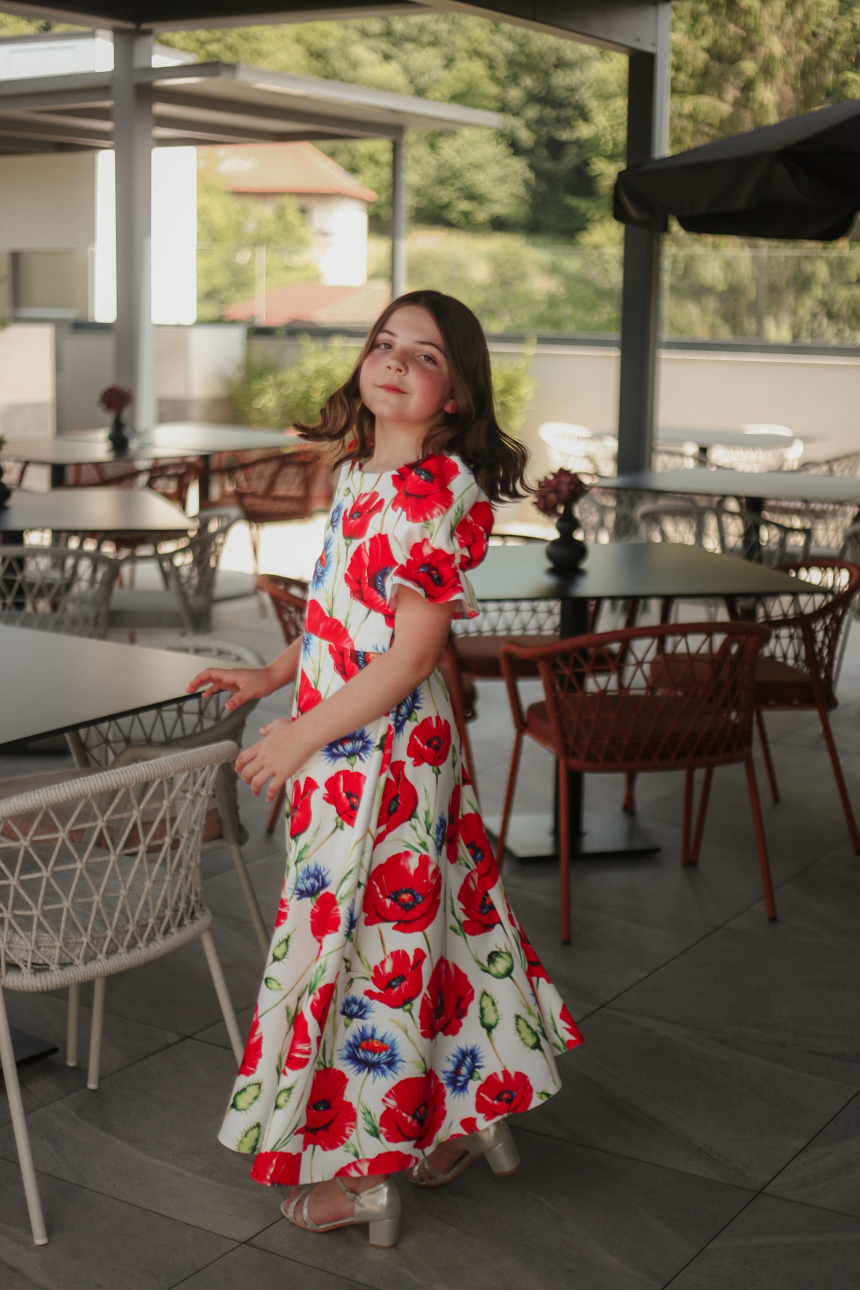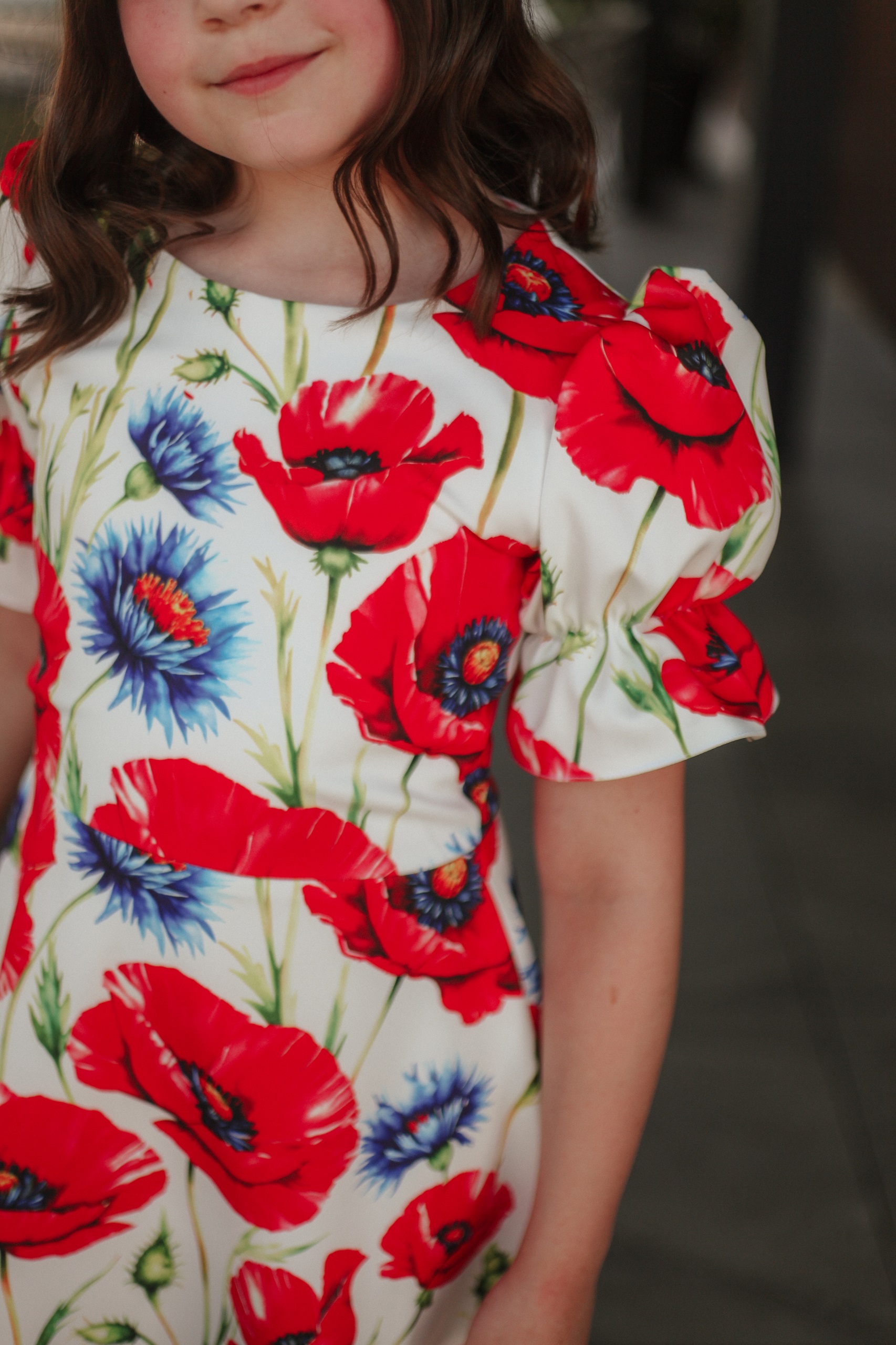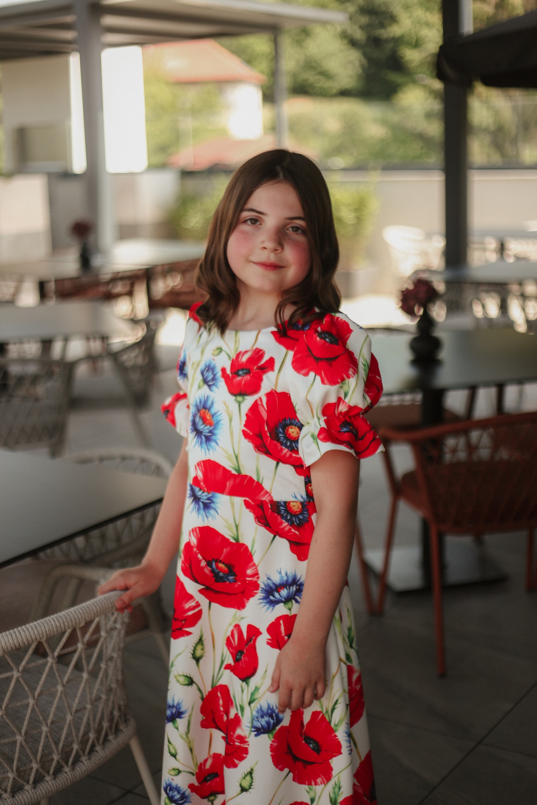 Această rochie este alegerea ideală pentru fetițele cu vârsta între 9 și 11 ani care adoră culorile și florile! Confecționată din stofă imprimată de calitate, cu un design floral vesel în nuanțe vibrante de roșu și albastru pe fond crem, rochia are un croi lejer și feminin. Mânecile bufante și talia ușor accentuată oferă un aer jucăuș și elegant, perfect pentru aniversări, serbări, cununii sau petreceri de familie.