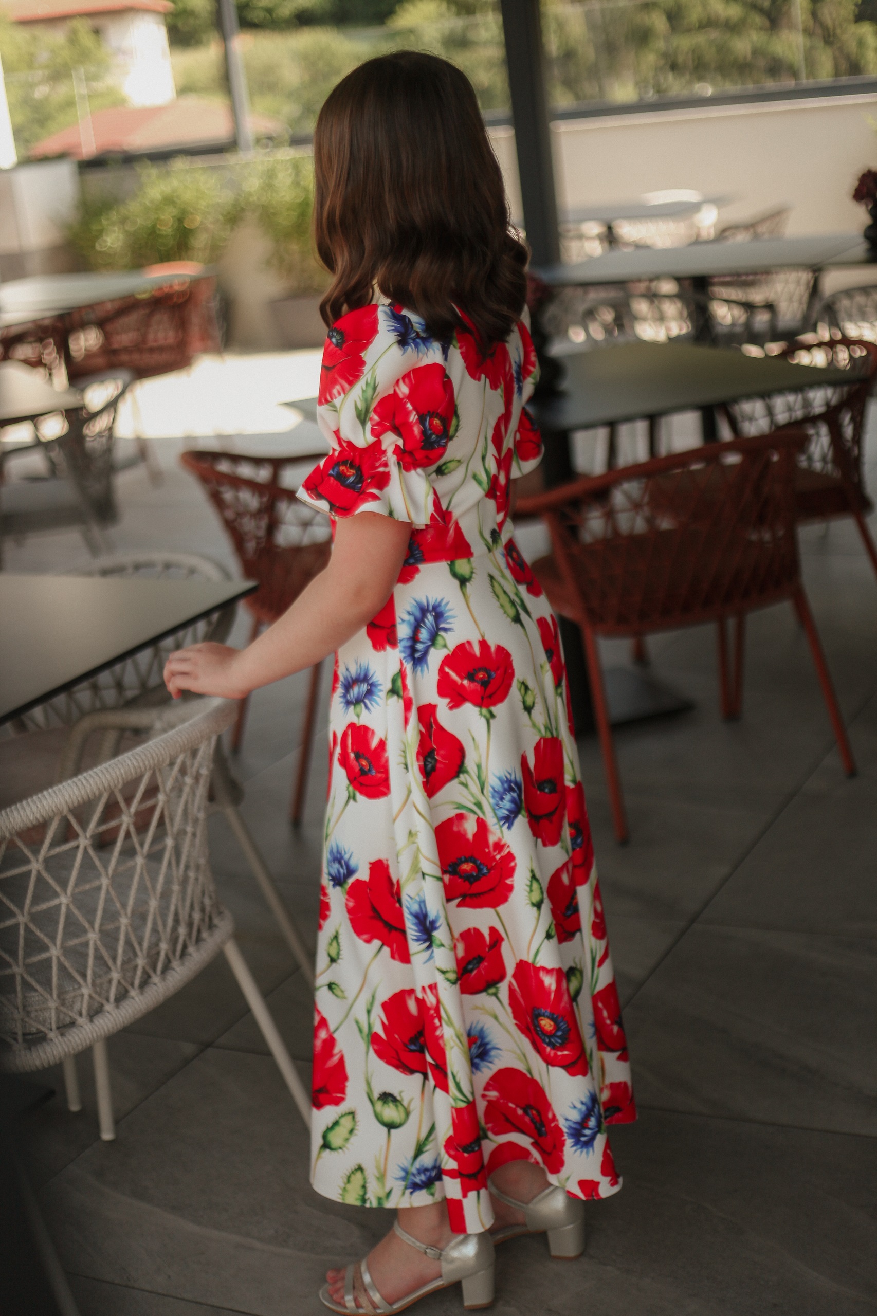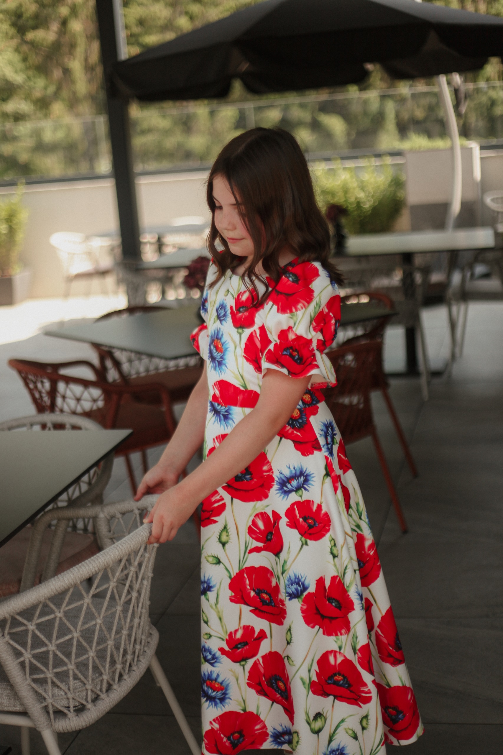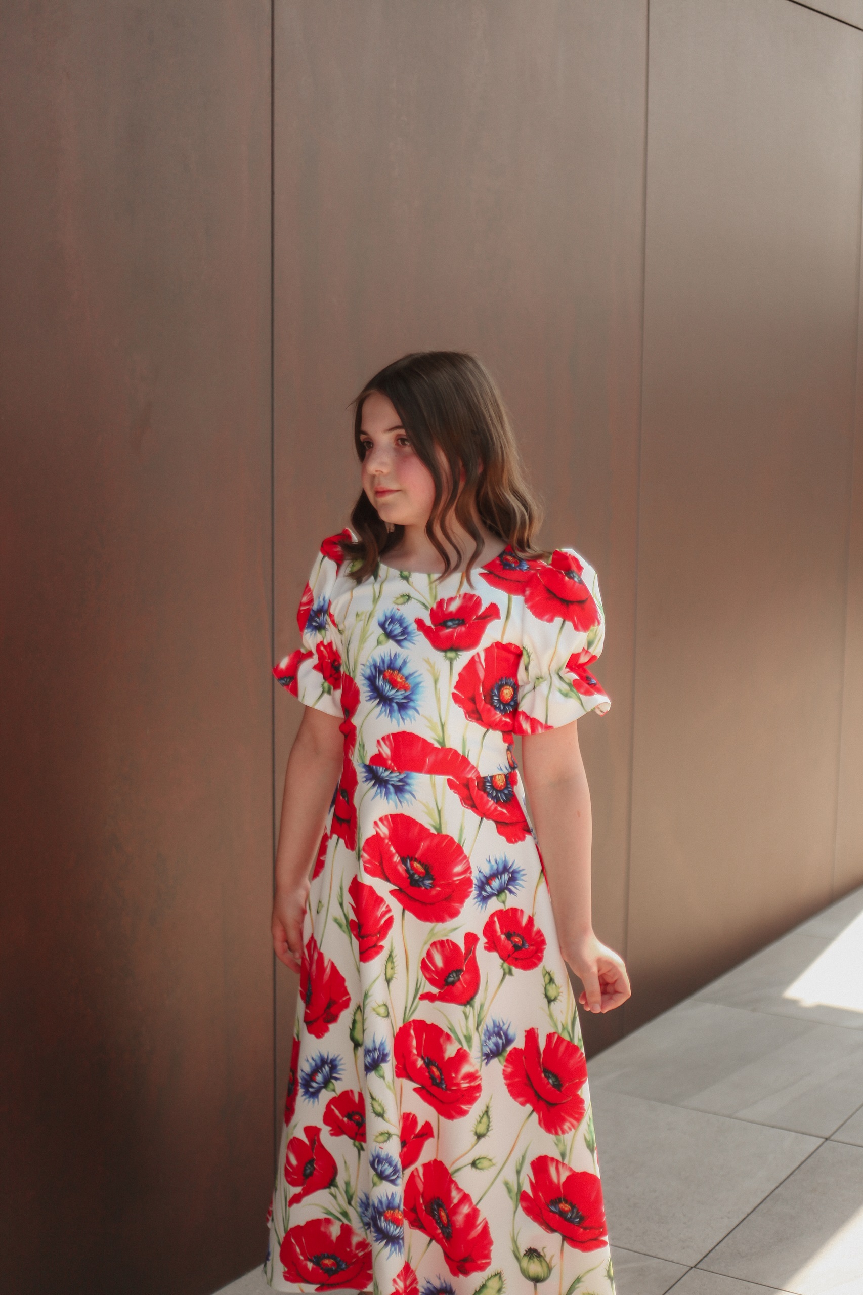 Această rochie este alegerea ideală pentru fetițele cu vârsta între 9 și 11 ani care adoră culorile și florile! Confecționată din stofă imprimată de calitate, cu un design floral vesel în nuanțe vibrante de roșu și albastru pe fond crem, rochia are un croi lejer și feminin. Mânecile bufante și talia ușor accentuată oferă un aer jucăuș și elegant, perfect pentru aniversări, serbări, cununii sau petreceri de familie.