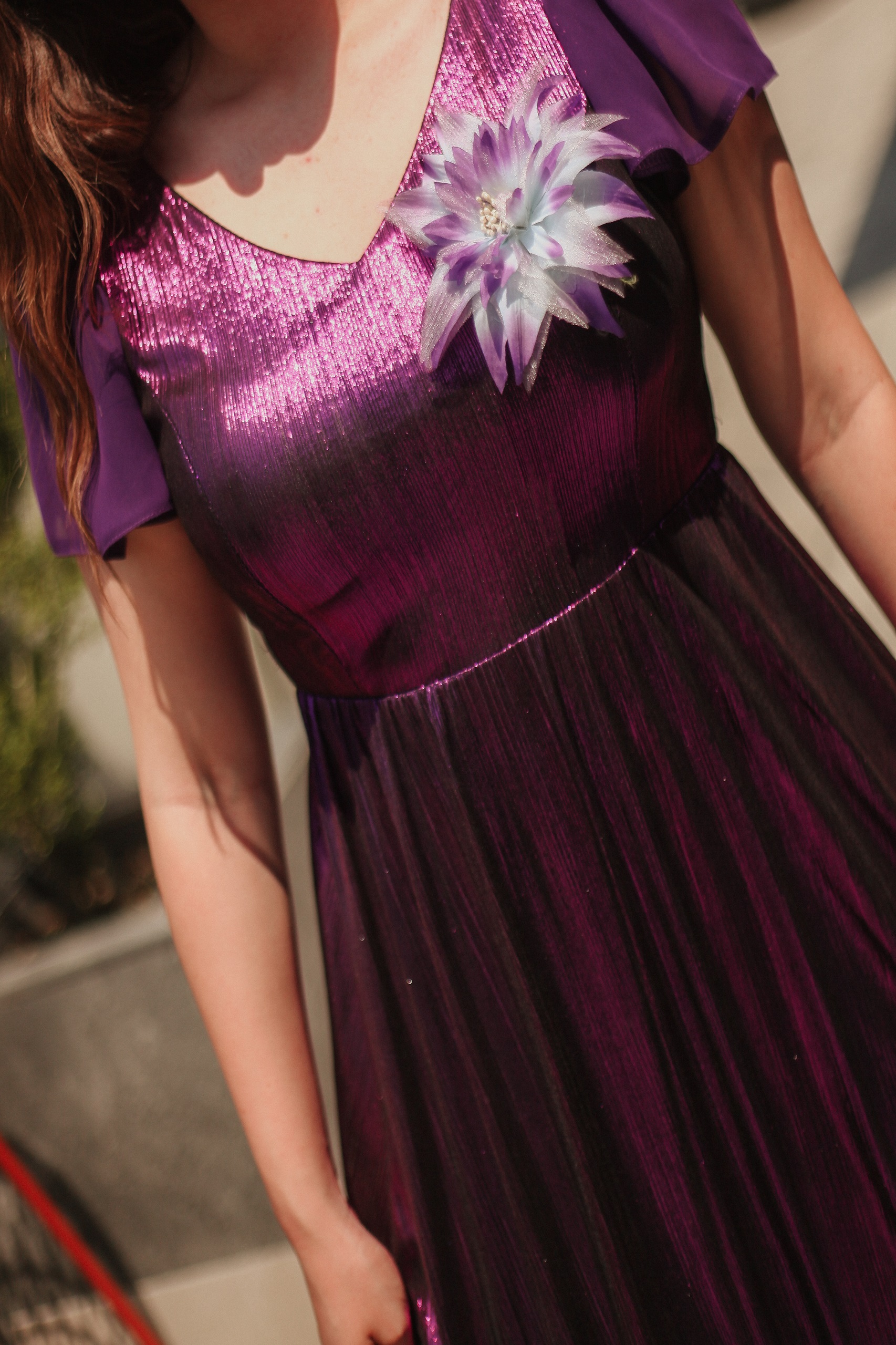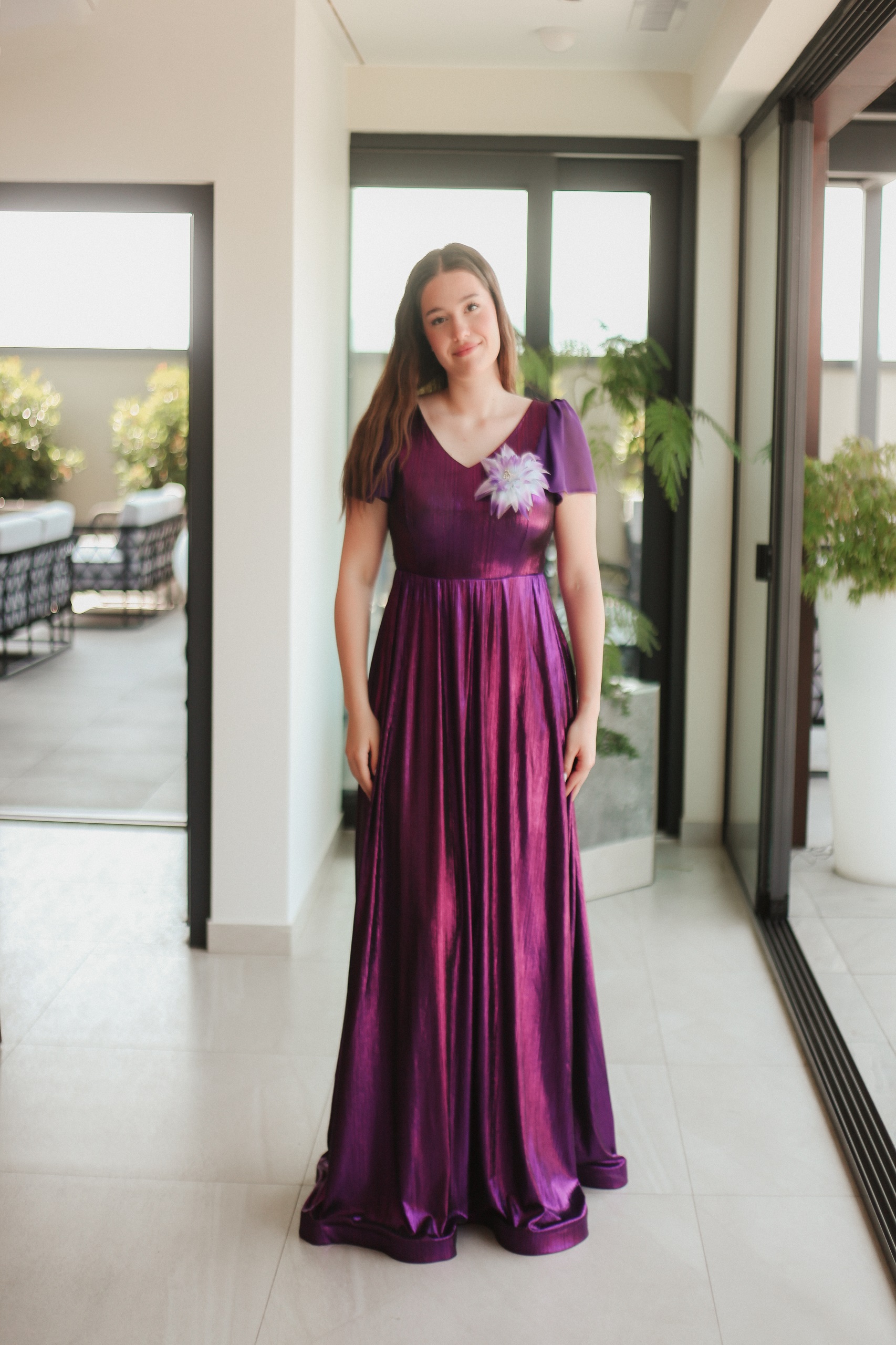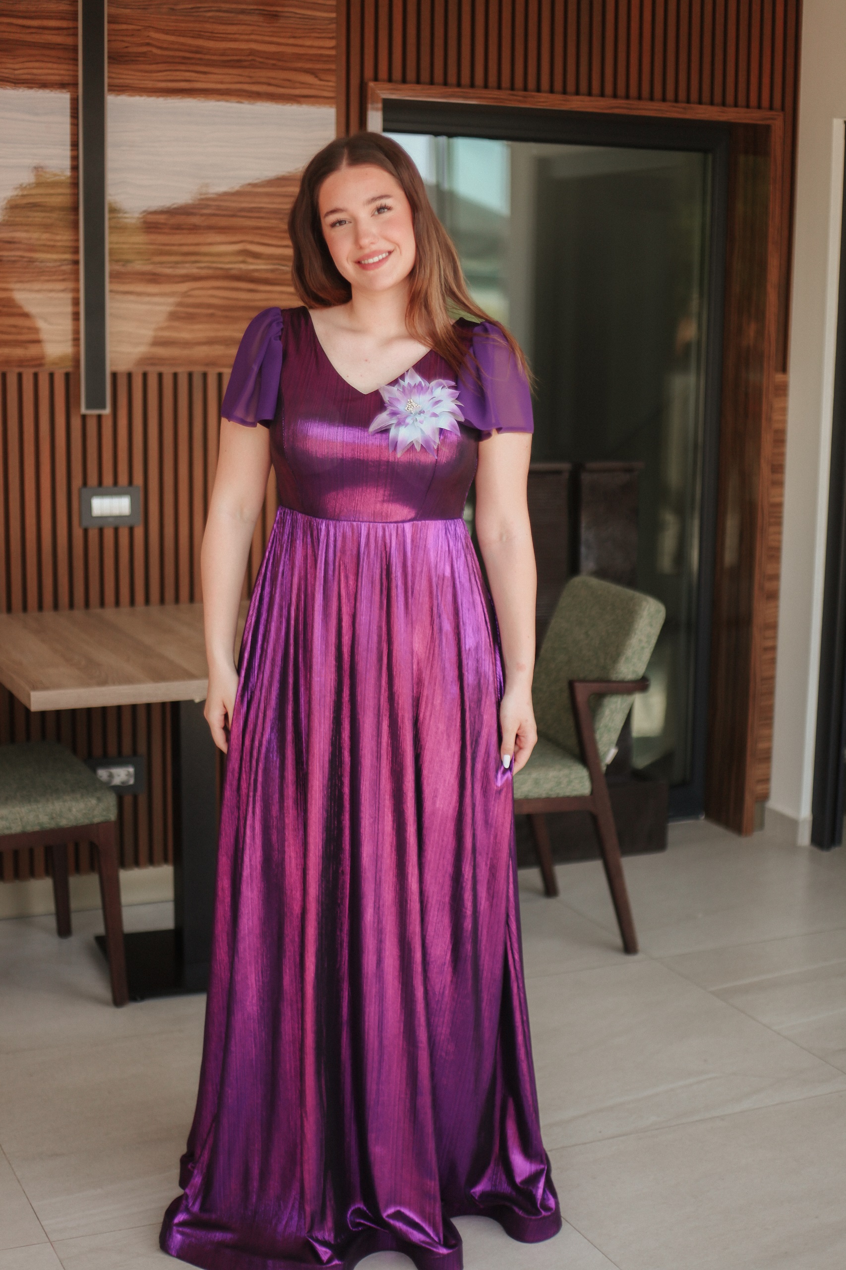 Rochia perfectă pentru o apariție memorabilă – această piesă realizată din mătase lucioasă în nuanțe intense de mov te cucerește prin eleganță, simplitate și detalii de efect. Materialul fluid și ușor reflectorizant alunecă frumos pe siluetă, creând o prezență grațioasă și impunătoare. Decolteul în V și croiala lungă, în stil A-line, avantajează orice tip de siluetă, în timp ce floarea textilă aplicată pe bust adaugă un detaliu feminin și rafinat. Perfectă pentru evenimente de seară, gale sau ceremonii elegante.