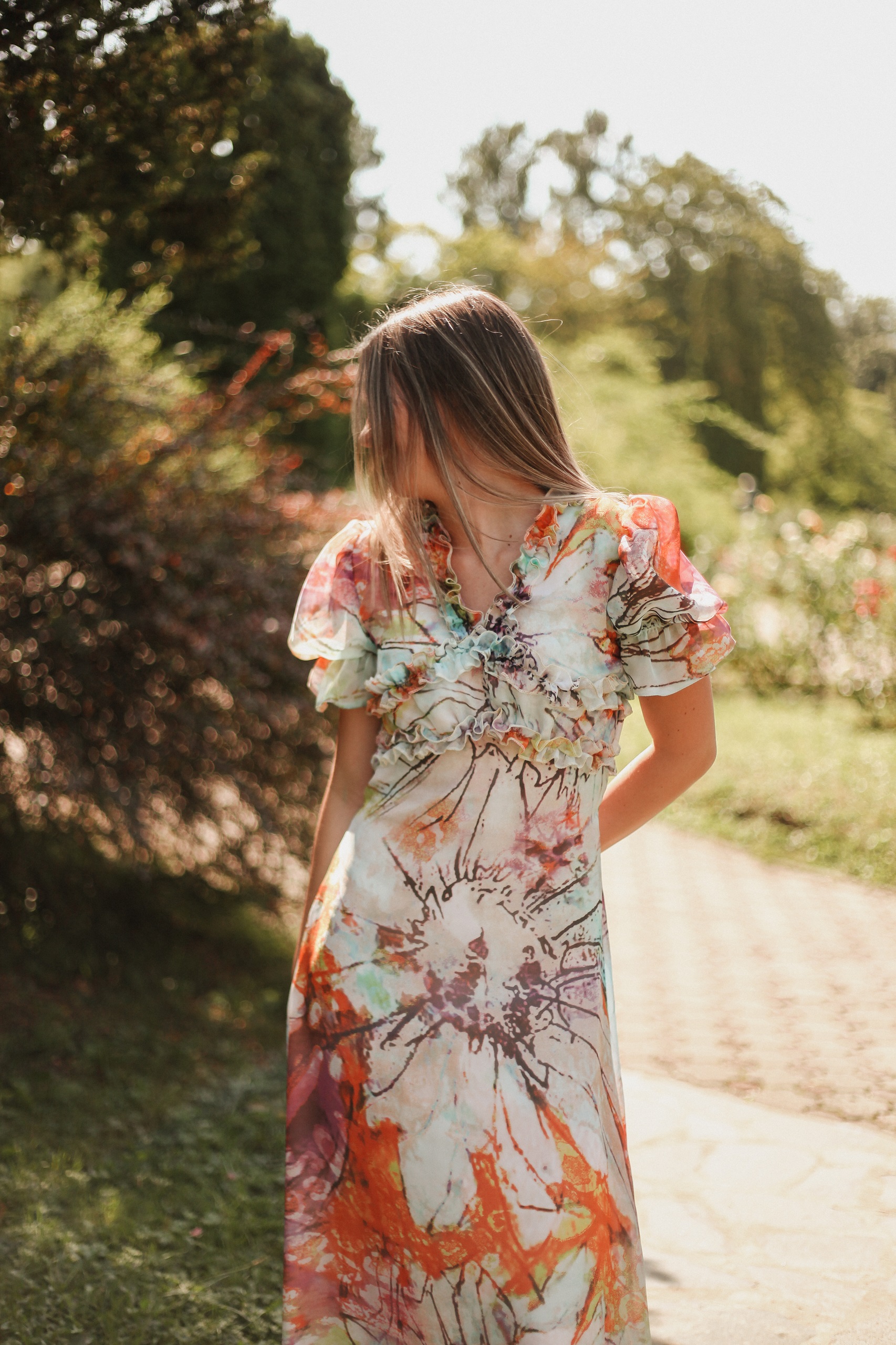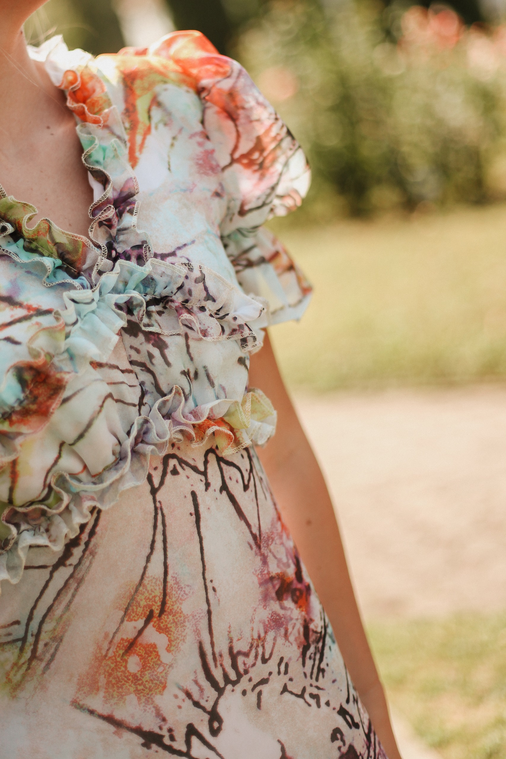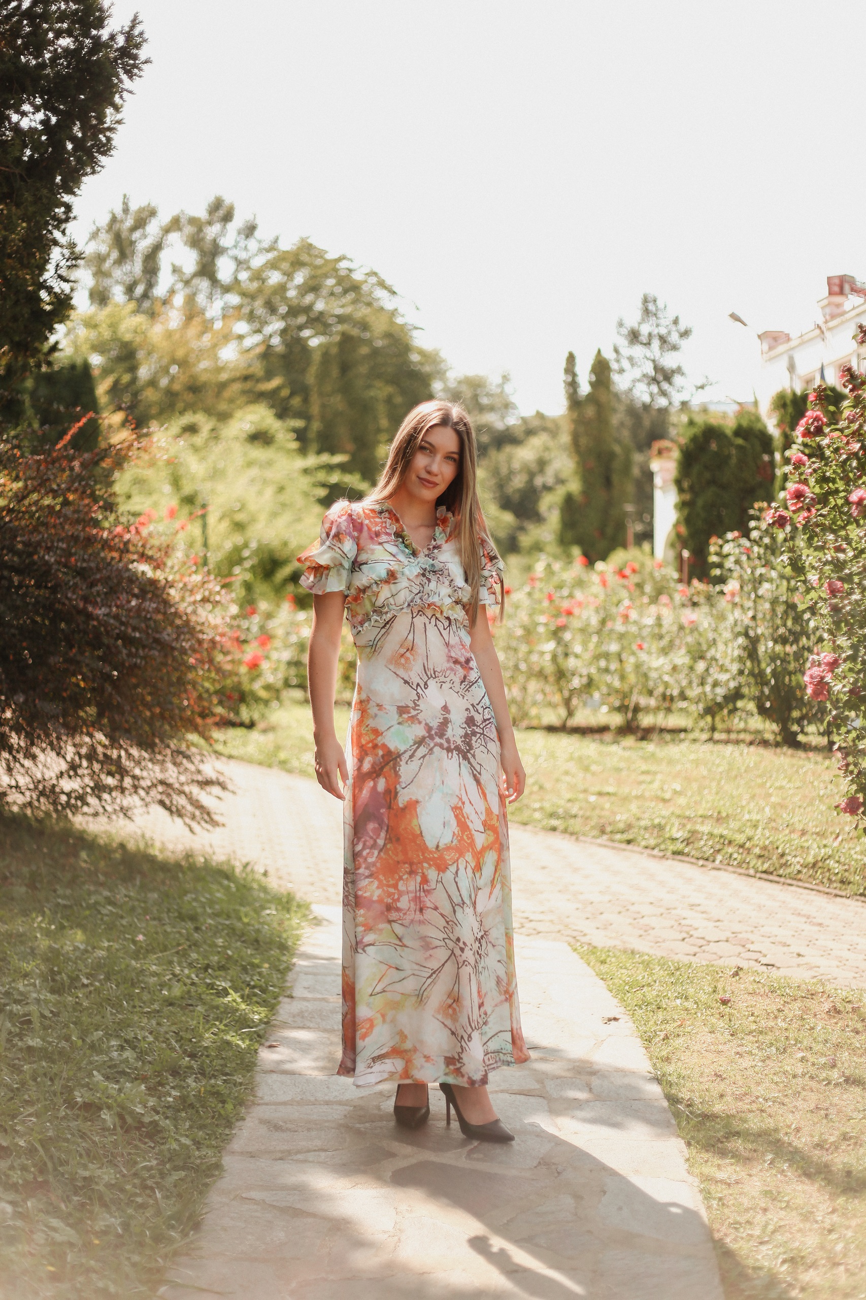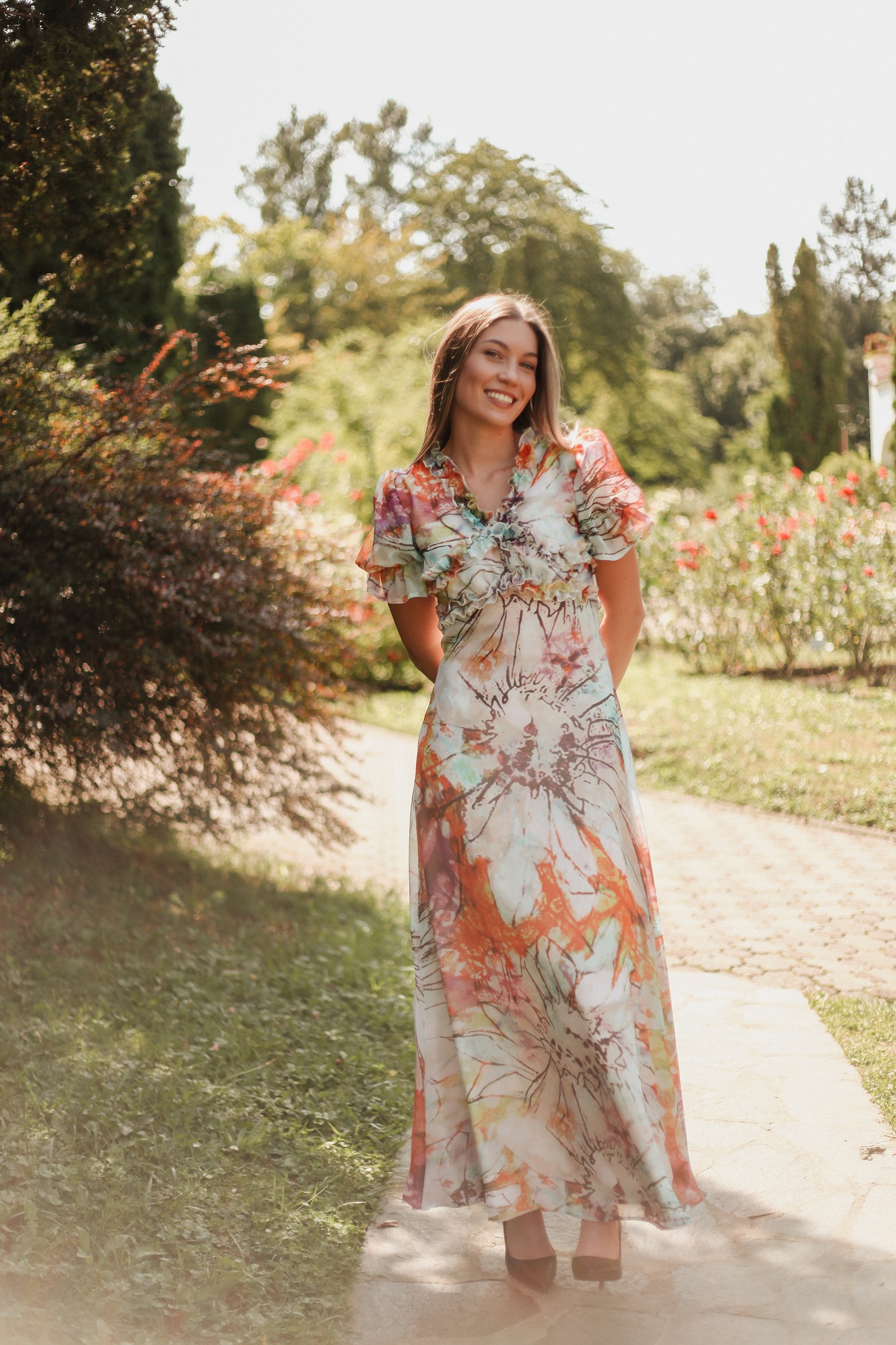 Rochia Tyle este o rochie foarte comodă realizată din voal imprimat cu volane pe față
