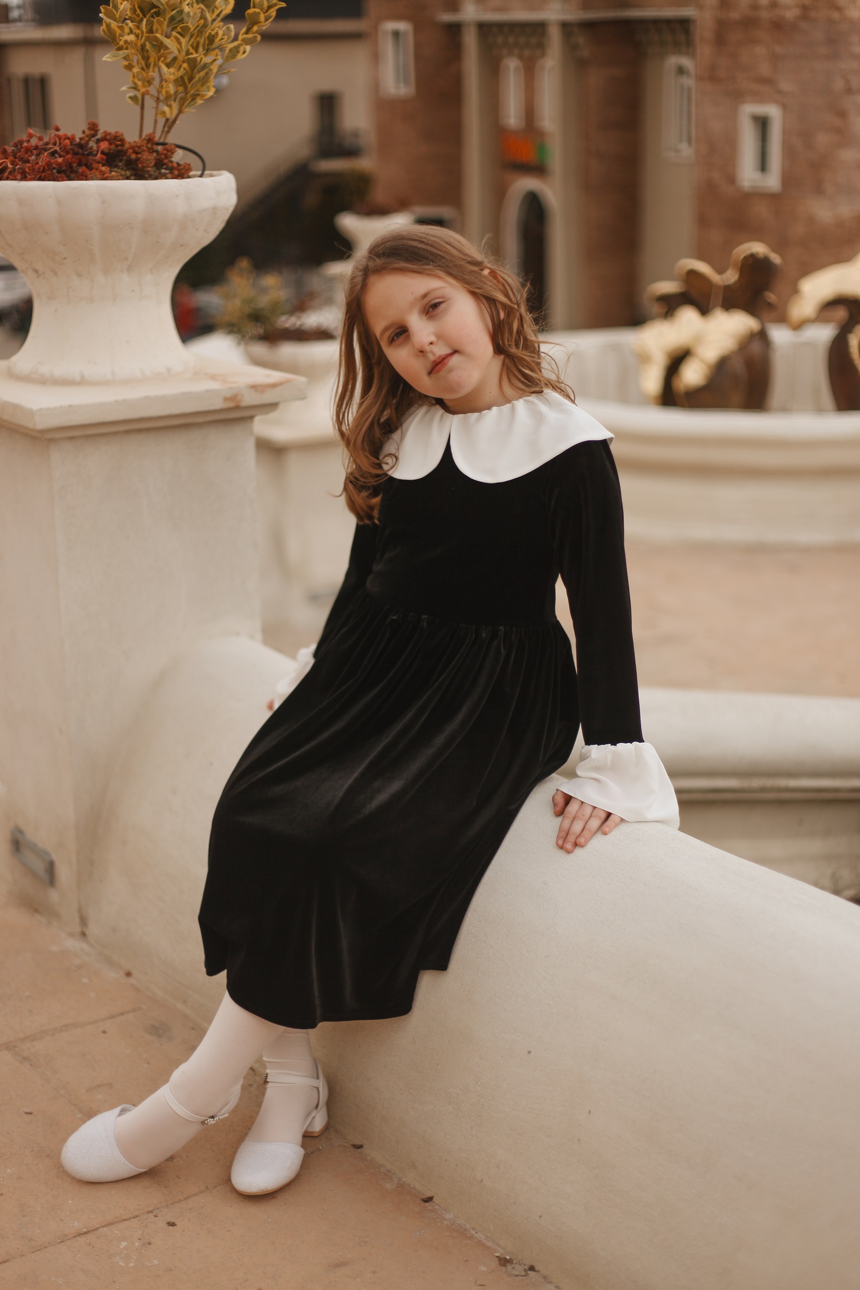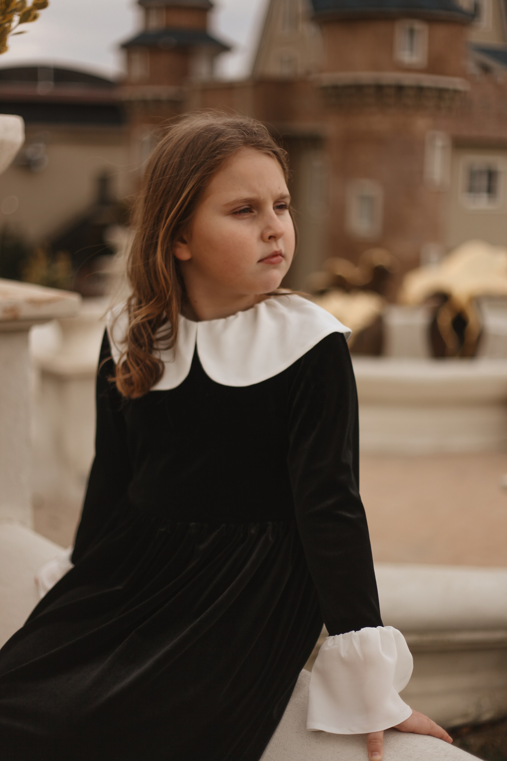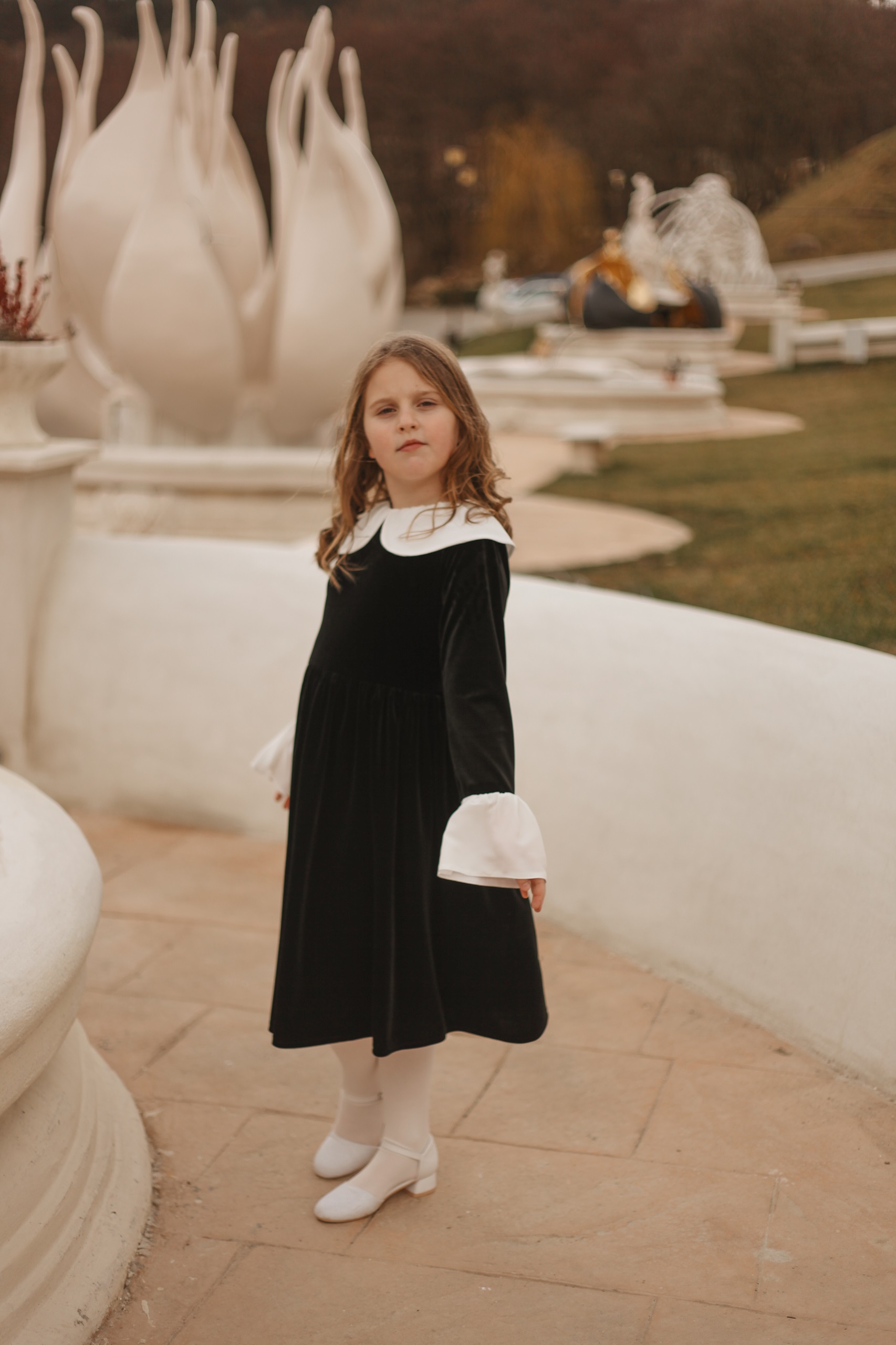 realizată din catifea de calitate cu guler și manșete din triplu voal.