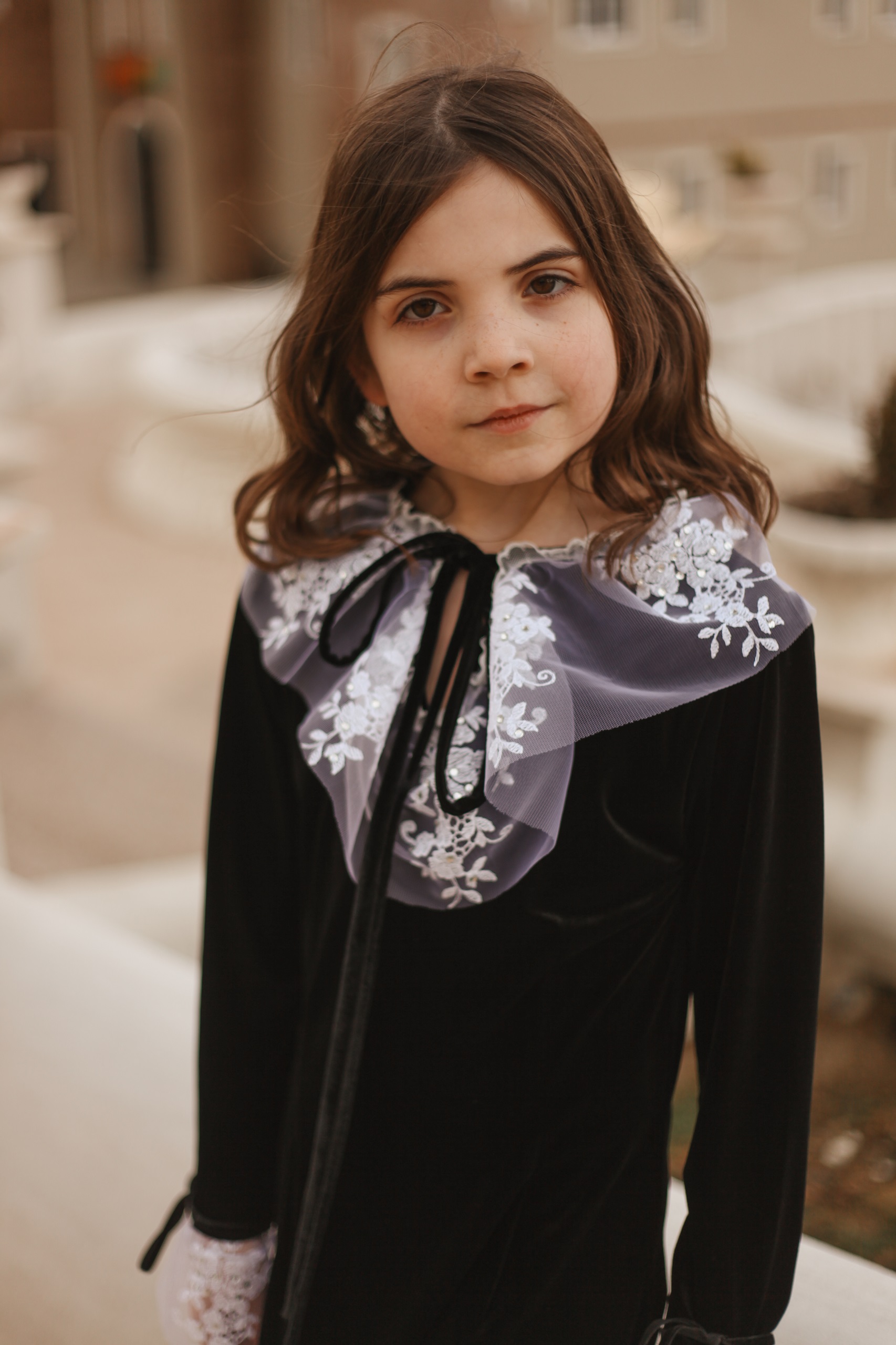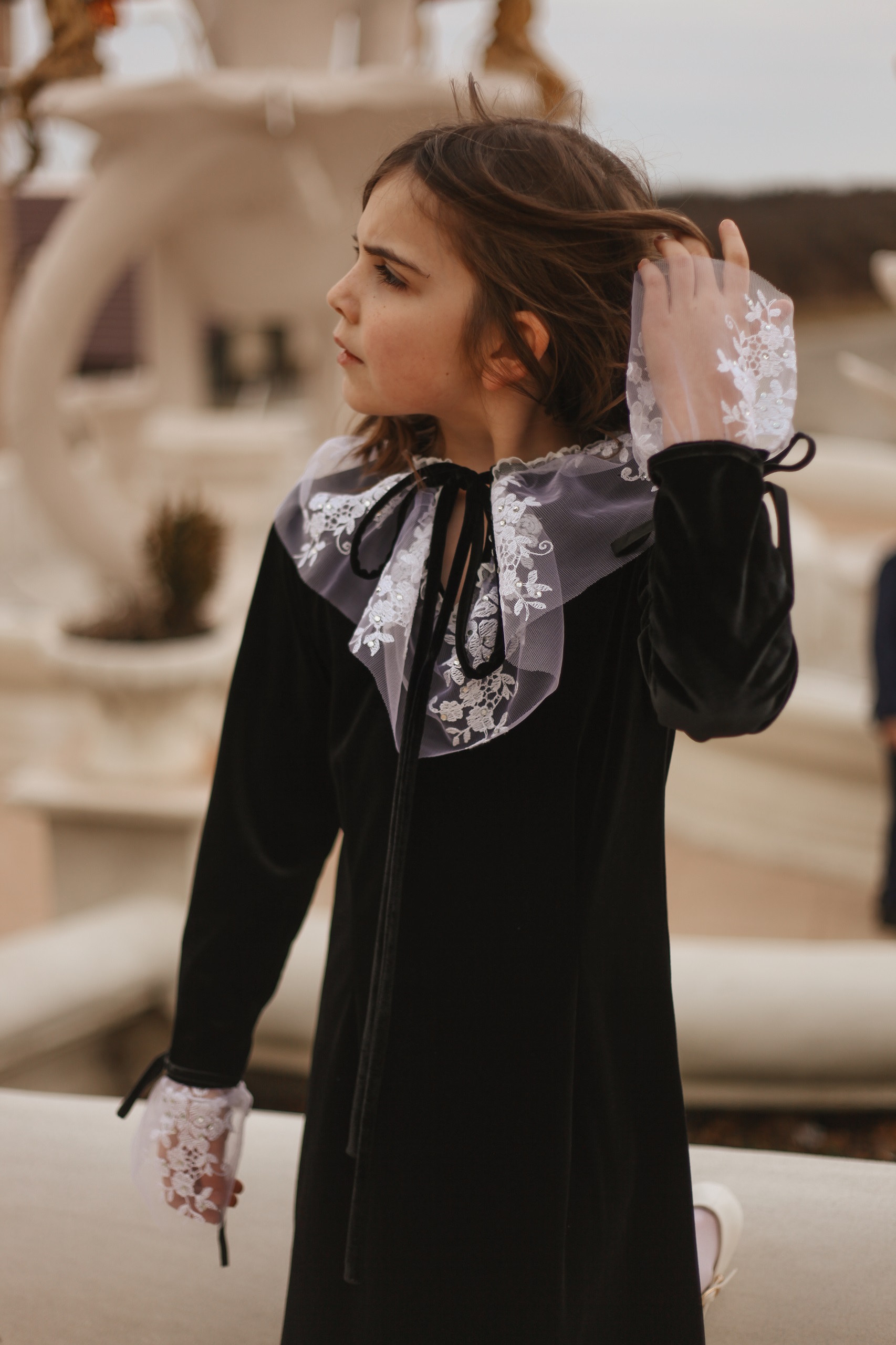 Rochia pentru fetițe Simra, este o rochie foarte elegantă realizată din catifea cu guler și manșete din voal cu perle.